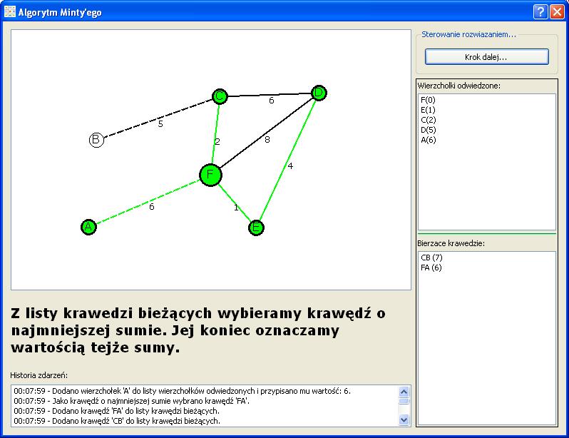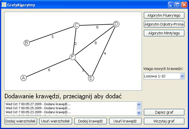 Przy okazji podnoszenia jednej oceny powstał prosty program prezentujący 3 algorytmy operujące na grafach. Pozwala on wprowadzić dowolny graf, o rożnych wagach a następnie prezentuje jego rozwiązanie krok po kroku.