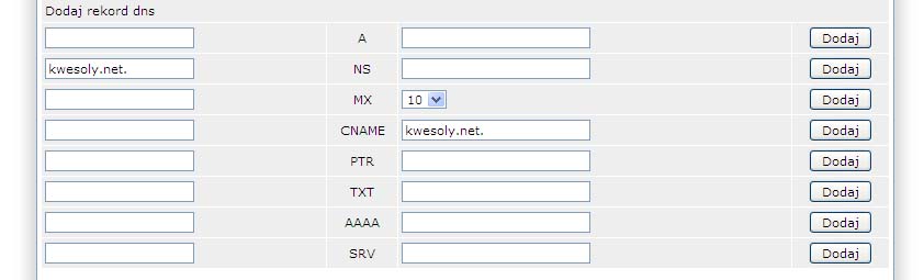 O ile na stronie google czy w usłudze SGH free DNS dane są jasno podzielone w kolumny o tyle w panelu Direct Admin umożliwia nam dodanie wpisu jako tylko dwóch wartości.