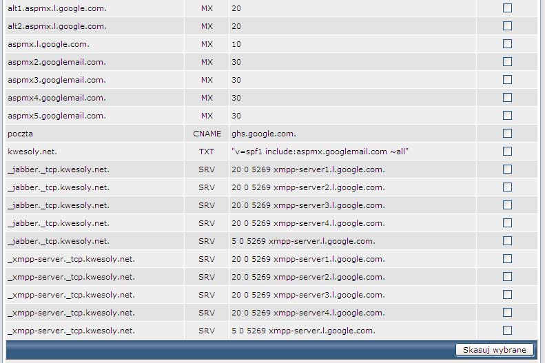 To co w powyższych wpisach jest pogrubione na czarno wpisujemy w lewą kolumnę a to co na zielono w prawą. niestety wpisy musimy dodawać pojedynczo, wpisując je do linijki z napisem SRV po czym klikając dodaj.